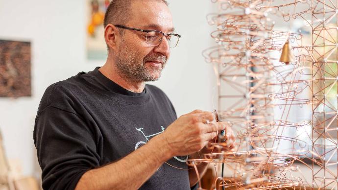 Seit 46 Jahren baut Alain Schartner Kugelbahnen aus Kupferdraht. In seinen Kunstwerken wirbeln Glasmurmeln, Metallkügelchen oder sogar Basketbälle auf verschlungenen Wegen dem Ausgang zu.